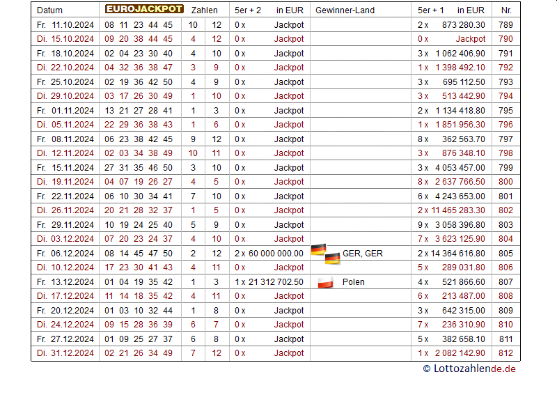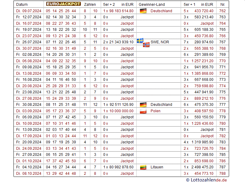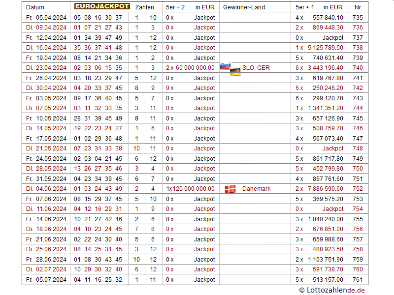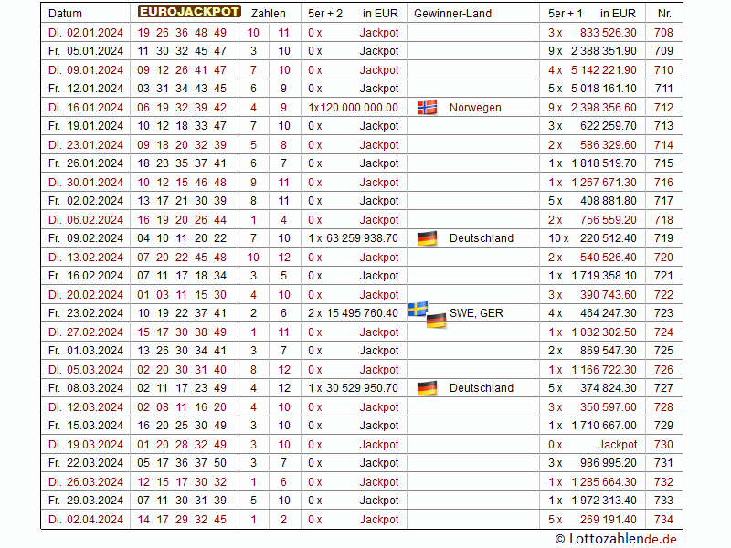 finden Sie Gewinnzahlen und Quoten aller Eurojackpot-Ziehungen seit dem