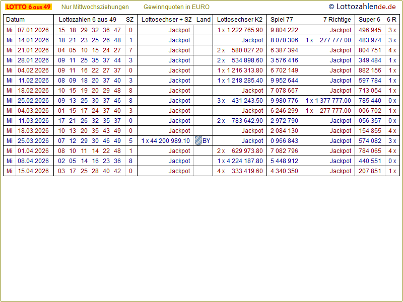 Lotto 2026 (Nur Mittwochsziehungen) |