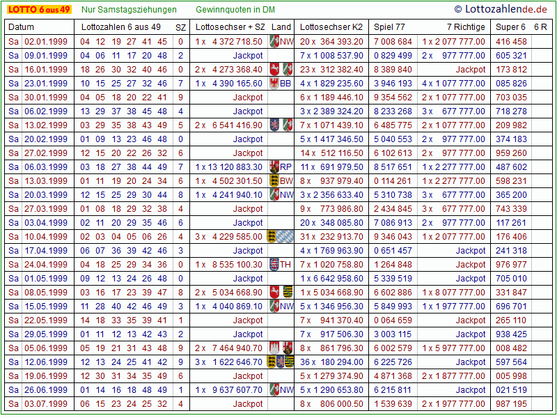 getrennt erfolgte, werden hier nur die Ziehungen von Lotto am Samstag gezeigt. |