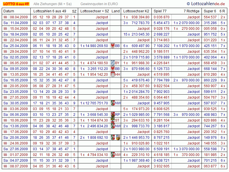 Zahlenarchiv Lotto 2009 (von 1955 bis heute)