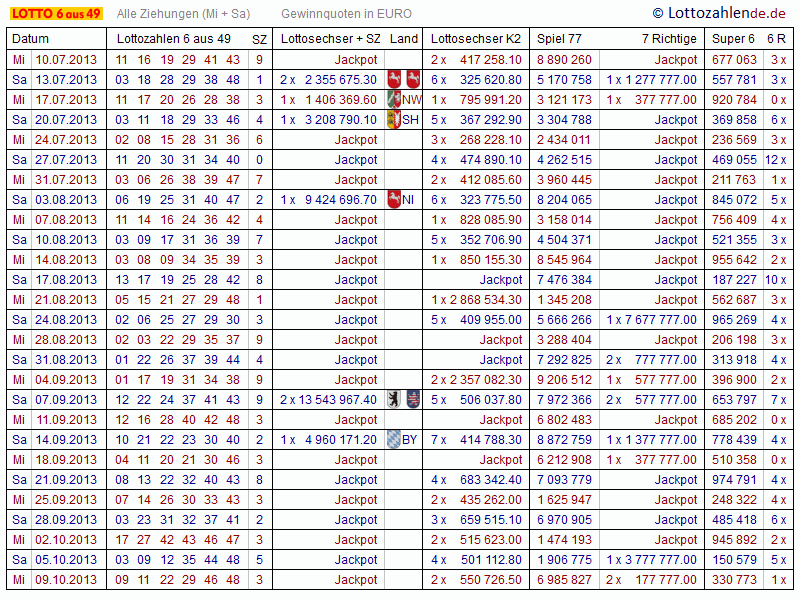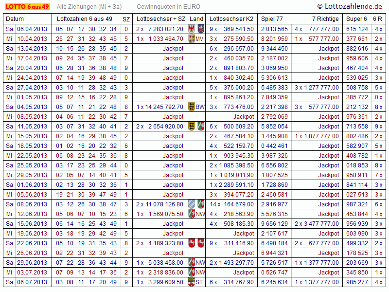 Im Zahlenarchiv finden Sie vergangene Gewinnzahlen und Quoten für Lotto 6 aus 49, Spiel 77 und die Super 6. Der Zeitraum erstreckt sich von 1955 bis heute. Alle Angaben erfolgen ohne Gewähr.