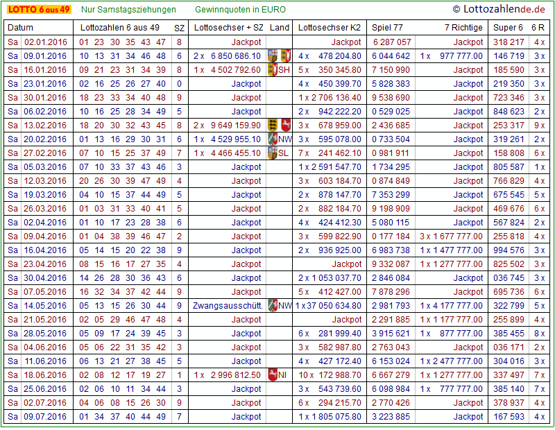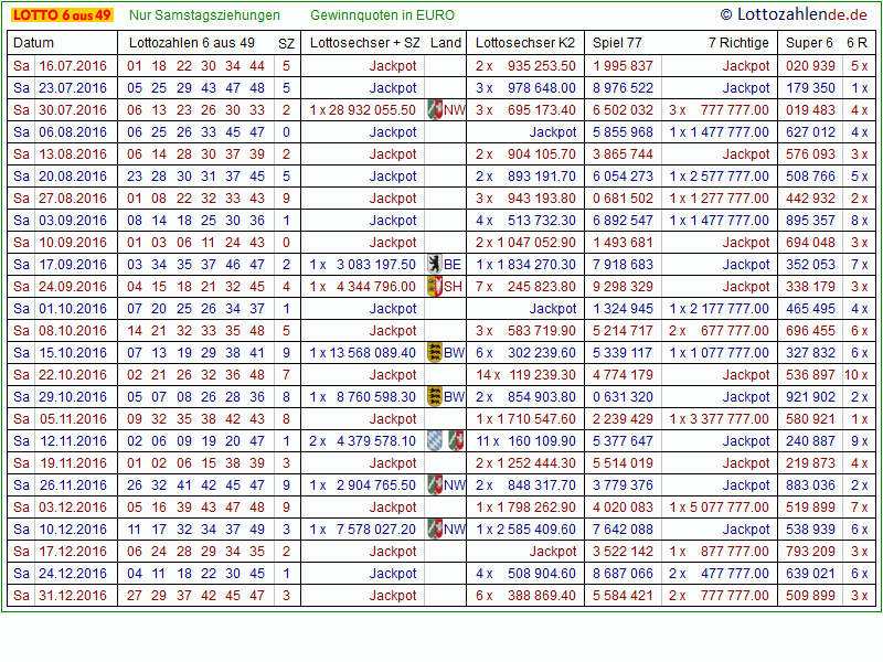 Zahlenarchiv Lotto 2016 (Nur Samstagsziehungen)