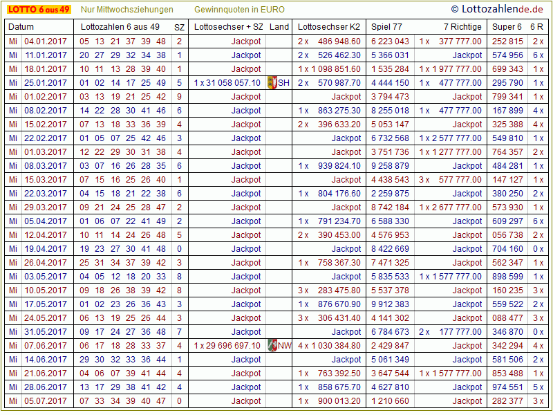 Lotto 2017 (Nur Mittwochsziehungen) |